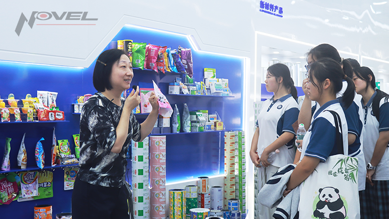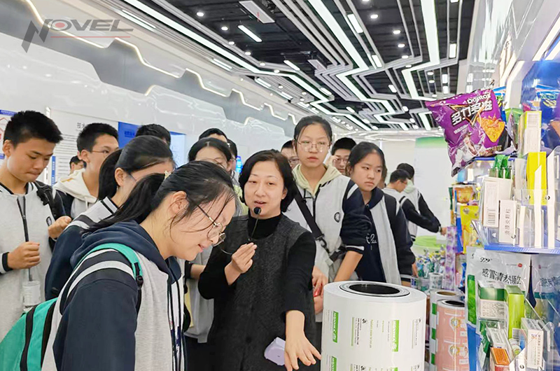 座談結(jié)束,在工作人員的帶領(lǐng)下,研學(xué)團(tuán)隊(duì)先后參觀了永新股份展廳和MES系統(tǒng)控制中心。展廳內(nèi),各品類包裝產(chǎn)品、高性能薄膜琳瑯滿目,從食品包裝到工業(yè)應(yīng)用,從環(huán)保材料到智能包裝,工作人員詳細(xì)介紹了產(chǎn)品的研發(fā)過程、性能特點(diǎn)及應(yīng)用領(lǐng)域,讓同學(xué)們直觀感受到包裝材料的多樣“膜”力。MES系統(tǒng)控制中心內(nèi),永新股份信息部經(jīng)理王健與同學(xué)們進(jìn)行互動(dòng)問答,現(xiàn)代化的智能管理界面實(shí)時(shí)呈現(xiàn)著生產(chǎn)全流程數(shù)據(jù),同學(xué)們紛紛感嘆工業(yè)智能化帶來的高效與精準(zhǔn)。