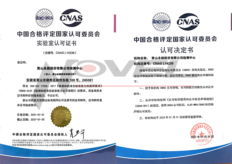 2021年1月,永新股份實驗室成功通過中國合格評定國家認可委員會(下稱CNAS)的審核,獲得實驗室認可證書(注冊號:CNAS L14238),躋身國家認可實驗室之列。